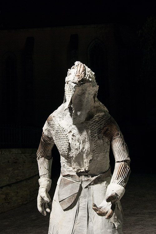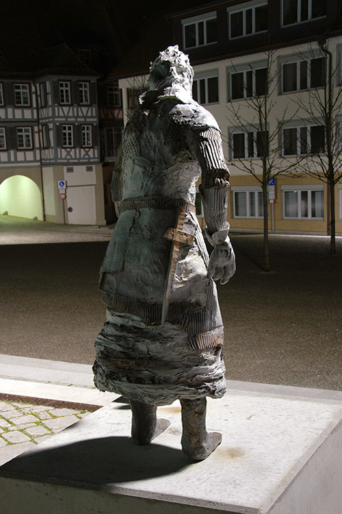 Die Skulptur „Markgraf” (Stiftshof in Backnang ) ist in seiner Haltung und Materialität wie eine personifizierte Verdichtung des Gründungsmoments der Stadt . Es kommen ruppige Materialien zum Einsatz, die für meine Arbeitsweise typisch sind. Abdrücke aus Noppenfolien, hinzu kommen Arbeitsspuren, Rupfen Gips, oder gerippte Kartonage, die „ Ritterhandschuhe” sind banale Arbeitshandschuhe. Die Brüchigkeit und Wildheit der Figur, die den Eindruck erweckt, als würde sie das Innere nach aussen tragen, bekommt durch die Übersetztung in Bronze eine andere Deutung, so dass wir einen Ritter in kämpferischer Haltung und in richtiger Rüstung mit Gesichtsvisier wahrnehmen.” Zitat aus „ Der verstaute Raum” von Beate Ermacora, Kerber Art.