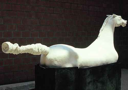 Die Skulptur bildet eine Analogie zu wissenschaftlichen Methoden des Forschens, u,a. Leben zu fixieren. Die glatte Oberfläche des Pferdes gibt Geschwindigkeit.