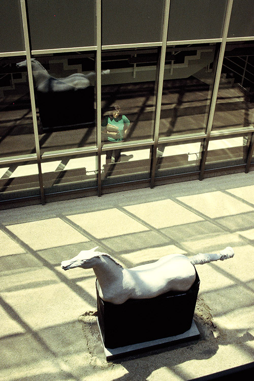 Die Skulptur weg bezieht sich in den Proportionen auf die Gliederung des Lichtschachtes des Verfügungsgebäudes und ist eine Verkehrung der Weite eines Platzes: in der Tiefe des Schachtes, dort, wo sich - im Bild des „Platzes”- ein Reiterstandbild erheben könnte, ist jetzt ein Pferd, wie in den Sockel gerutscht und in seiner Bewegung festgehalten.